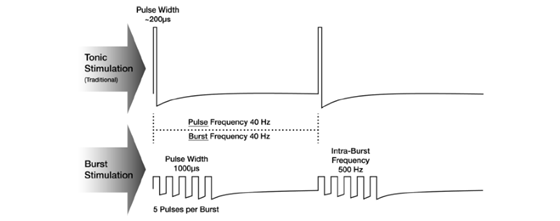 Examples of SCS waveforms. Tonic stimulation provides a consistent stream of pulses at a set frequency, pulse width, and amplitude. Burst stimulation delivers groups of pulses at a lower amplitude and a higher frequency than tonic stimulation. Bursts of pulses are followed by pulse-free periods.[10]